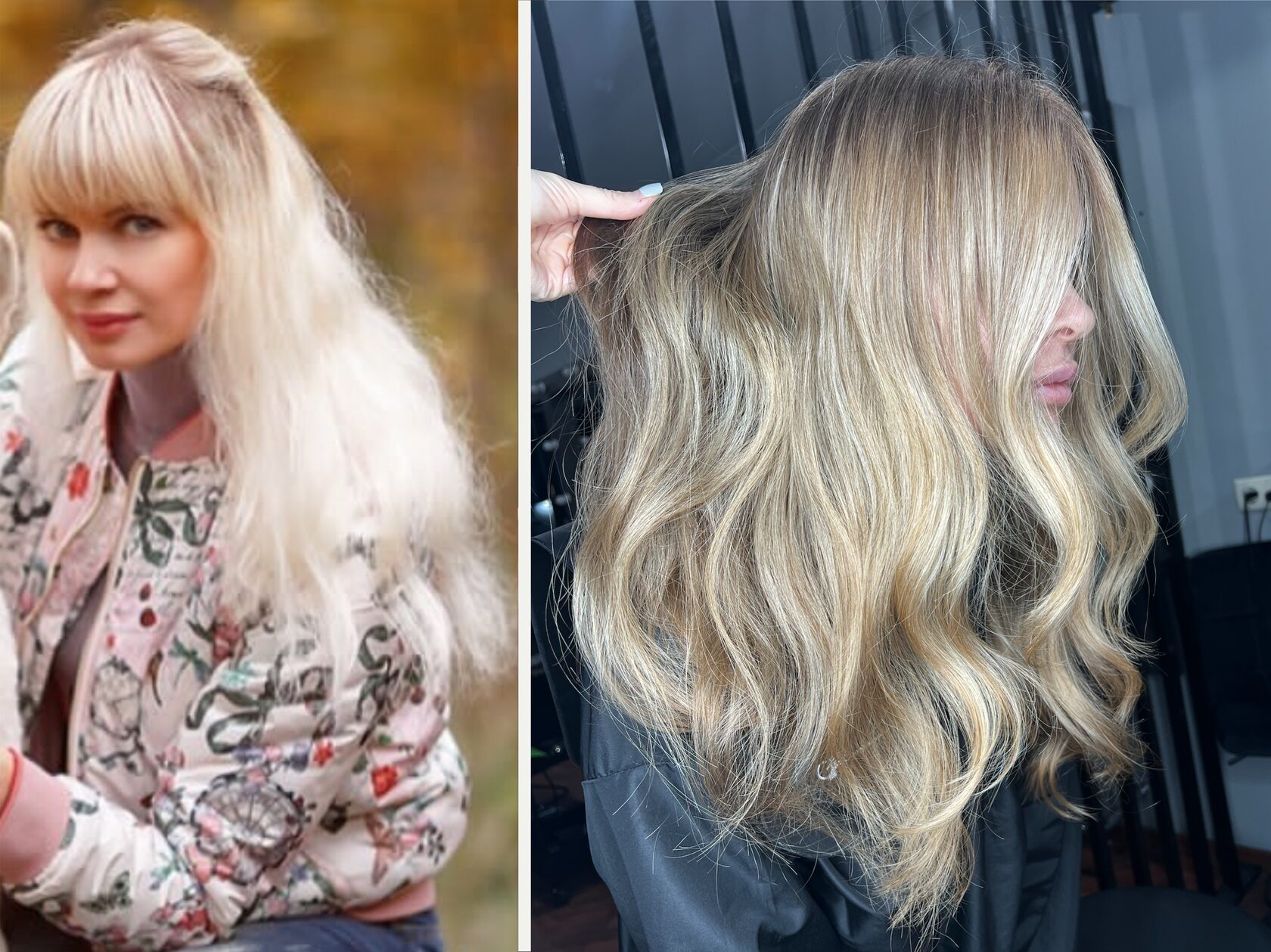 Запрос: Раиса пришла перед свадьбой 7 лет назад, с сожженым блондом после салона. Вместо холодного белого был зеленоватый цвет. Задача была исправить и сделать что-то приличное)